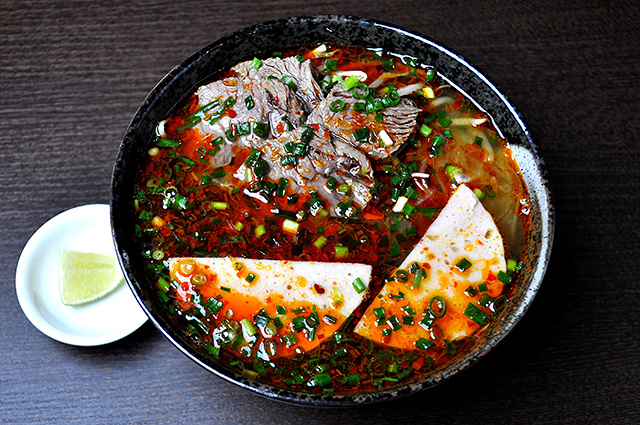 ベトナムといえば平たいライスヌードルのフォーが有名ですが、イエローバンブーではフォーのほかにもたくさん麺料理を取りそろえています。ブン・ボー・フエ(840円)もそのひとつ。フエ風牛肉麺のことで、食の都フエの名物料理です。ブンは丸くて太めの米麺でフォーに比べると歯ごたえがあります。