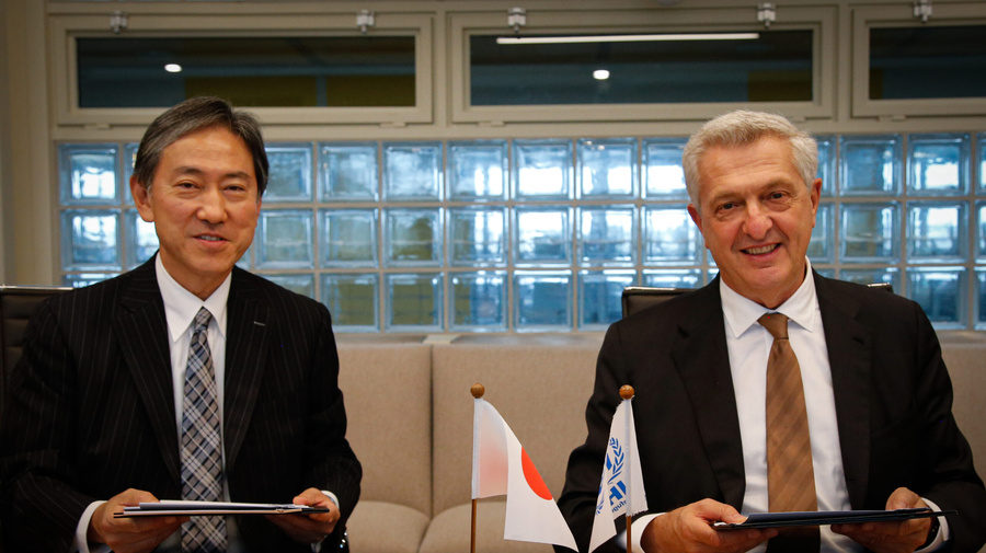 シリアに対する無償資金協力に関する書簡の署名・交換を行った尾池厚之・在ジュネーブ国際機関日本政府常駐代表特命全権大使とフィリッポ・グランディ国連難民高等弁務官