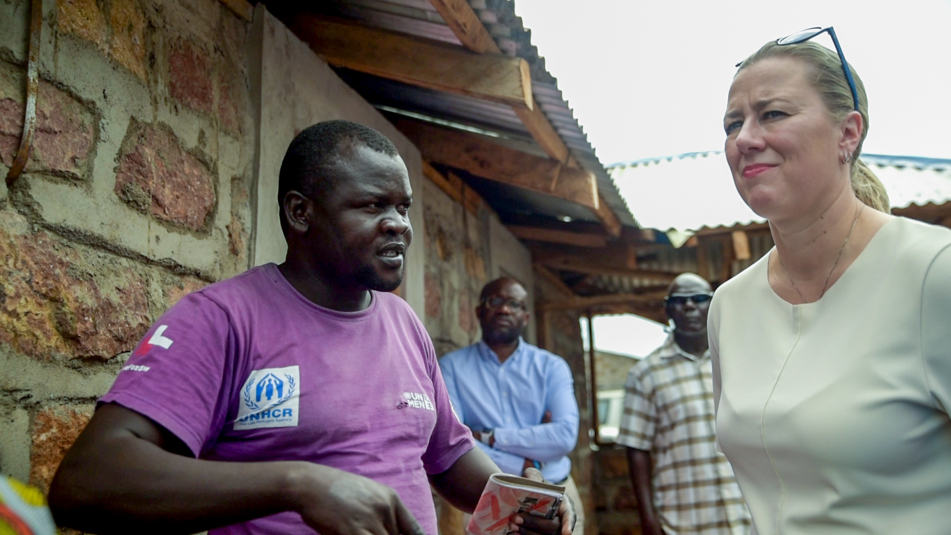 ohn Lokulu, from South Sudan is one of the refugees living in Kalobeyei that have successfully constructed permanent house for his family of six through UNHCR’s Cash Based Intervention (CBI) programme. He interacts with EU Commissioner for Partnership, Jutta Urpilainen during her visit in December 2019. ©UNHCR/Amina Rwimo