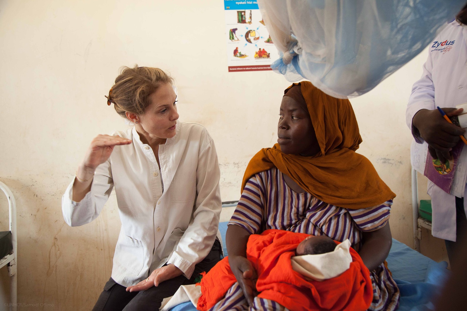 HRH Princess Sarah Zaed of Jordan inteacts with a Somali Woman who just delivered a baby at IRC hospital in Kakuma 4. UNHCR/S.Otieno