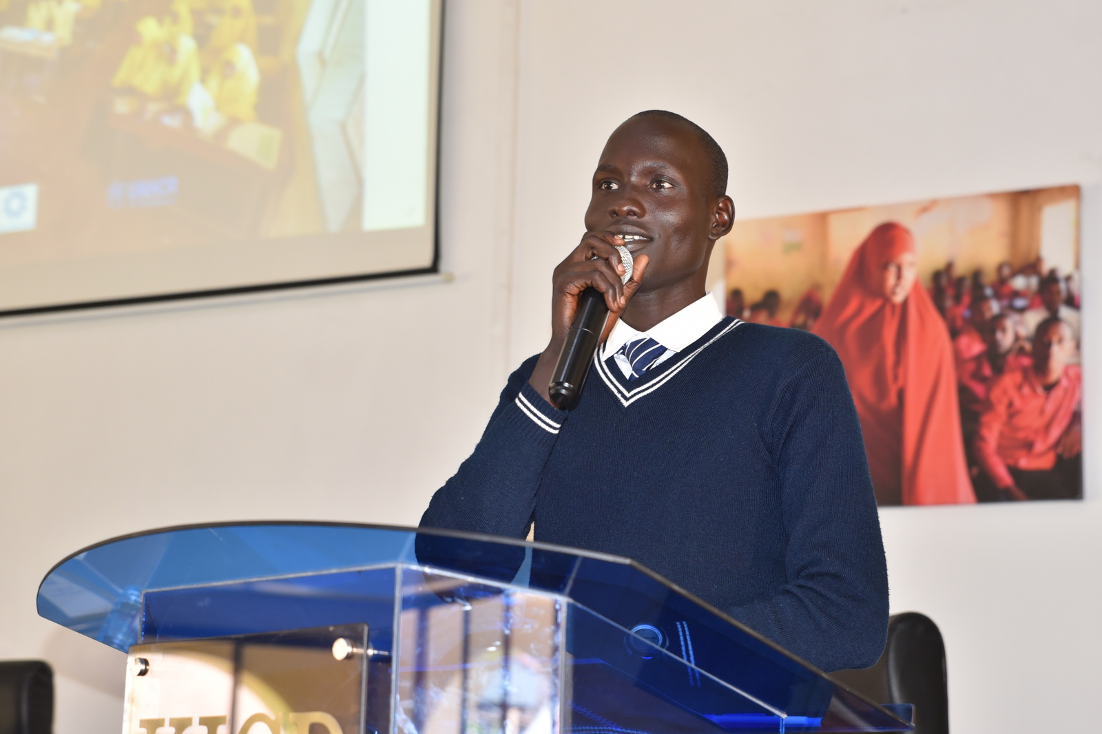 Finally, Gatluak Mut, a refugee from South Sudan, described his experience studying in a public primary school in Kakuma town. He explained that Kenyan learners encouraged him not to give up on education and has with time assimilated well to the education system. Aged 20 and the current Head Boy, Gatluak hopes to complete primary school next year at Kakuma Arid Zone. With a chuckle, Gatluak says, “Fellow learners and teachers in the school have motivated me to learn Swahili, I hope to become a Swahili teacher when I go back to South Sudan.”