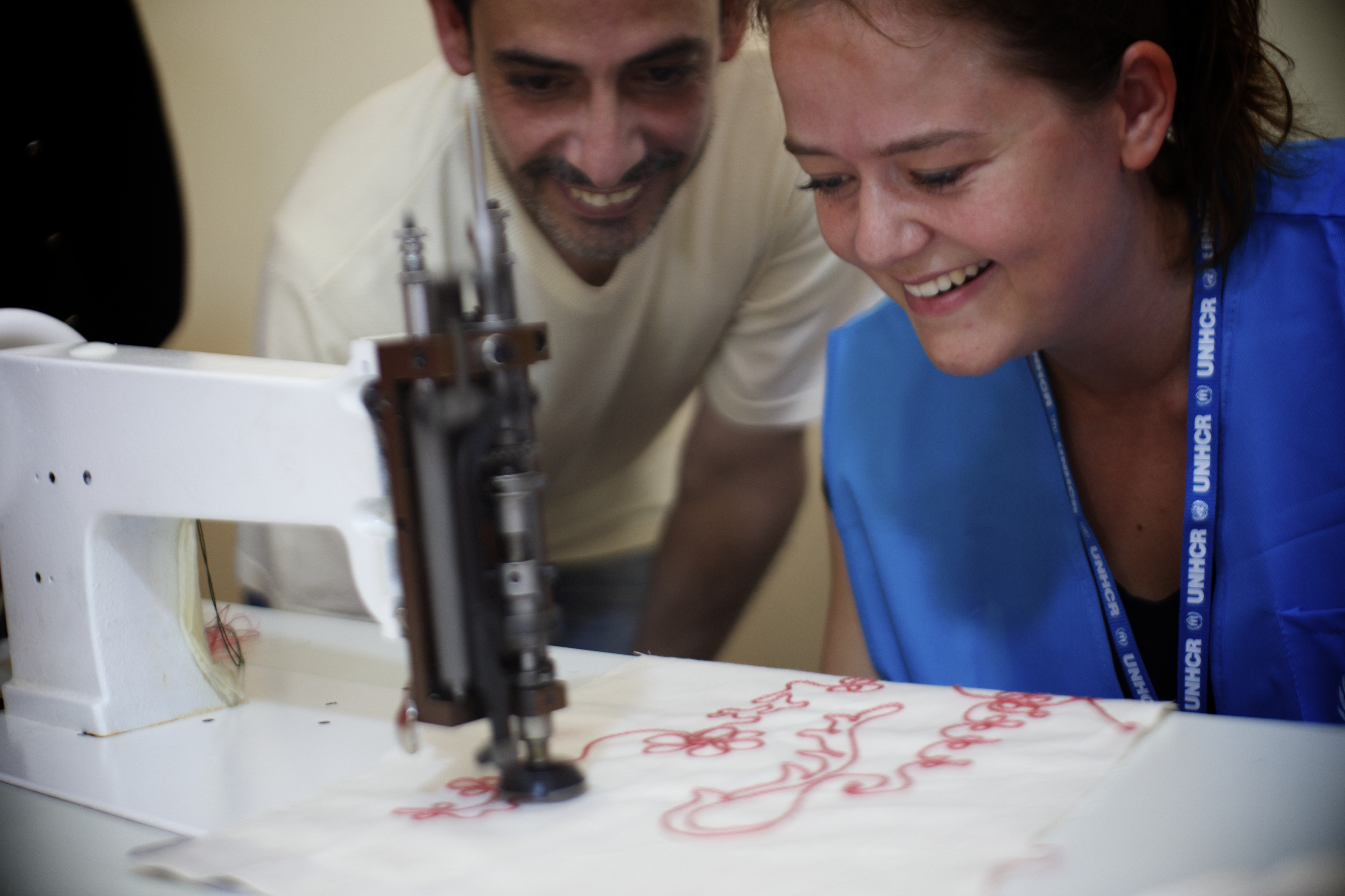 Maher, the head instructor for the Aghabani course, gives the first Aghabani lesson to Inge, an External Relations Officer with UNHCR. “It is unbelievably difficult to control the stitching”, admits Inge after her first attempts. “It is impressive how well these women have mastered the skill in such a short period of time”. (c) UNHCR/Sara Hoibak