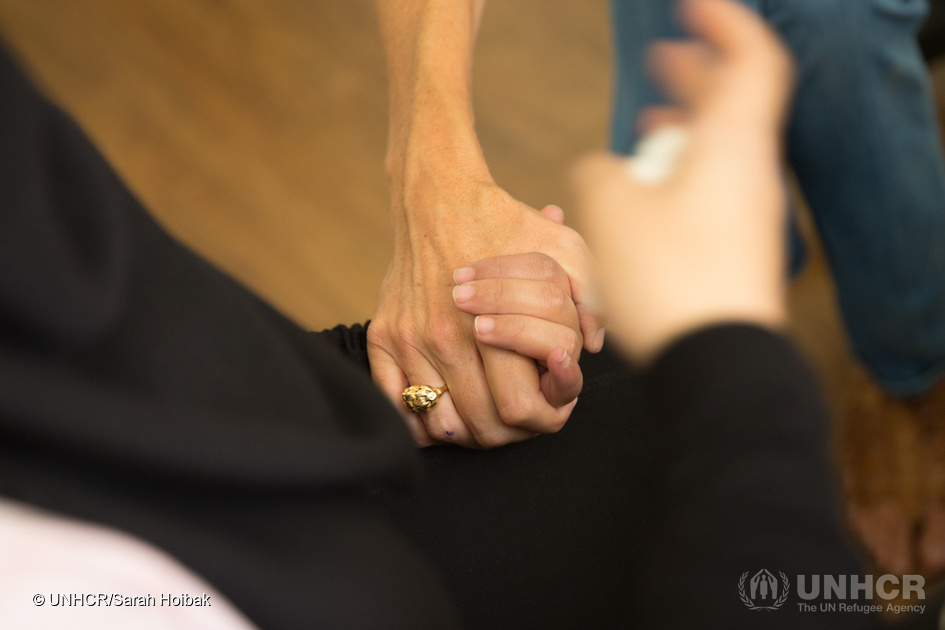 After her mother passed away, Nour had a breakdown and attempted suicide. Holding her hand, Emily listens to her story. (c) S. Hoibak / UNHCR
