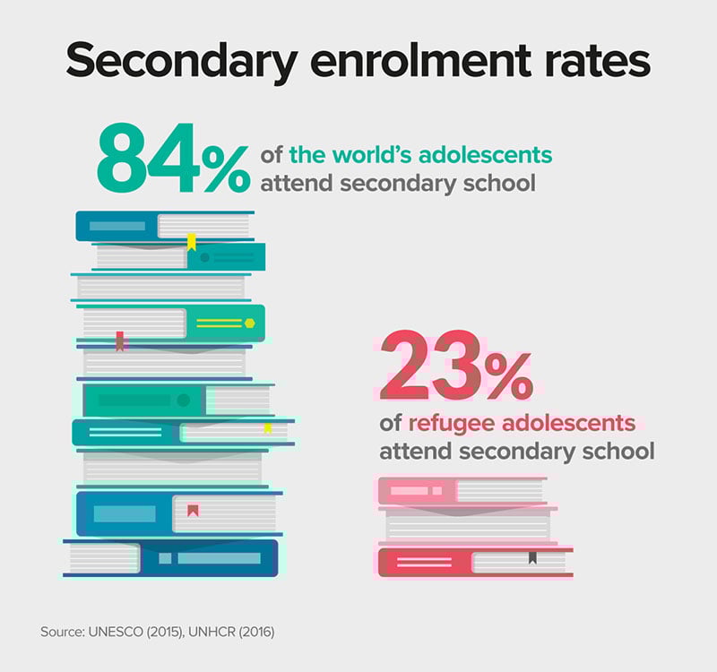 As refugee children get older, however, the obstacles only increase: just 23 per cent of refugee adolescents are enrolled in secondary school, compared to 84 per cent globally. In low-income countries, which host 28 per cent of the world’s refugees, the number in secondary education is disturbingly low, at a mere 9 per cent.