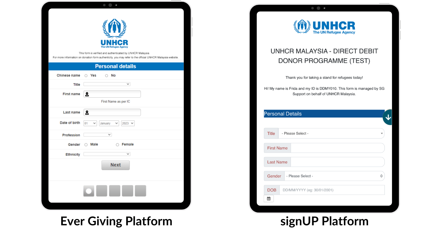 UNHCR Malaysia currently utilizes two offline acquisition platforms for face-to-face acquisition, with point-of-sale (POS) Instant Debit features. You may find our fundraisers equipped with tablets, or unique QR code that leads you to the acquisition platforms. Please be rest assured that our acquisition platforms are highly secured, with two reputable POS payment processors, STRIPE and 2C2P for our Instant Debit features.