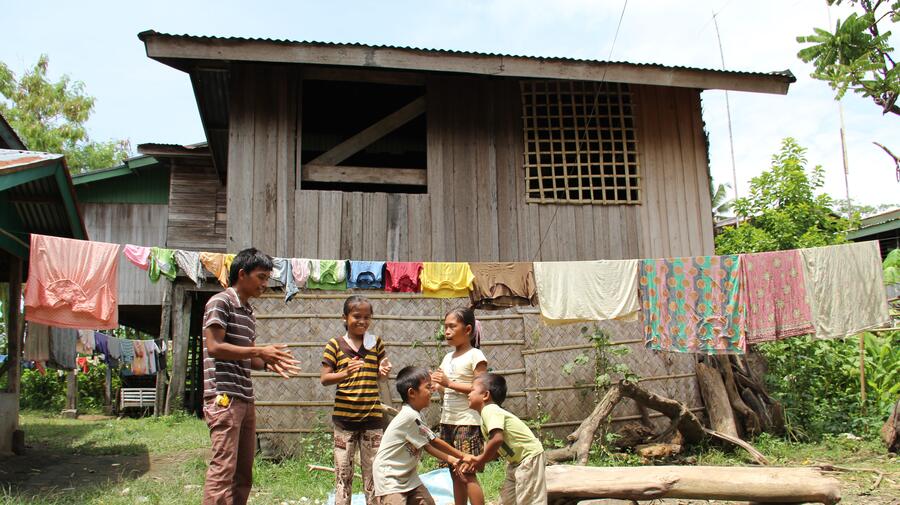 Kamama Dimasalang, 18, formerly displaced from his village by war, plays with relatives and neighbours in front of the shell of his beloved aunt's house in Mindanao, southern Philippines.