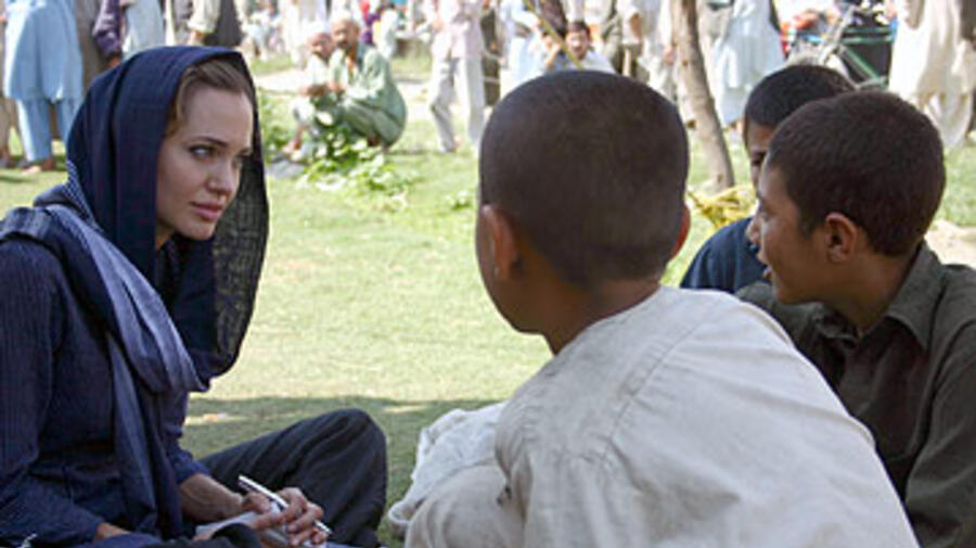 UNHCR Goodwill Ambassador Angelina Jolie talking to Afghans in Attock, Pakistan, before the convoy left for Afghanistan.