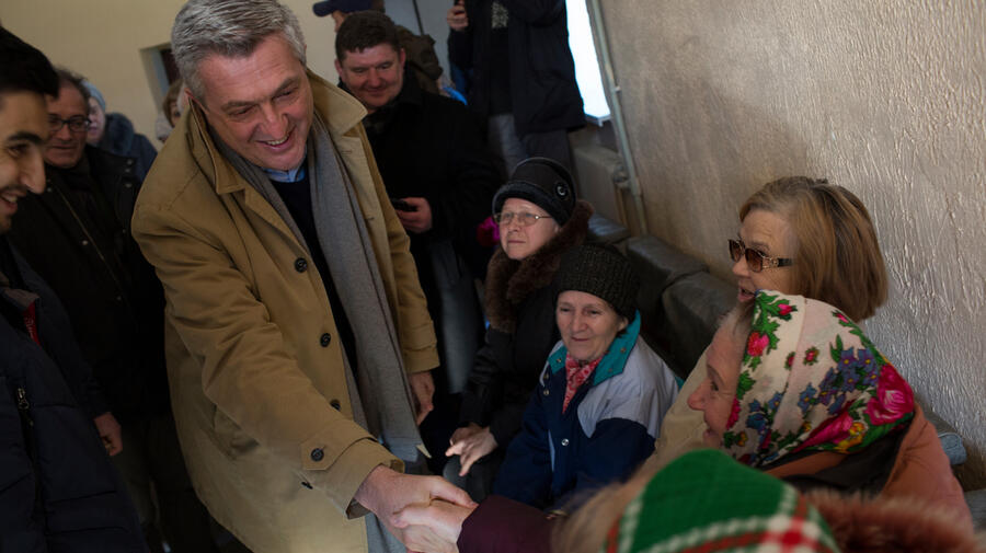 UN High Commissioner for Refugees Filippo Grandi meets with residents of a housing tower for Ukrainians displaced by fighting in the country's east. Grandi shakes hands with Zinaida Vognystaya, 74, who fled from Avdiivka and has been living in the complex since January 2015.