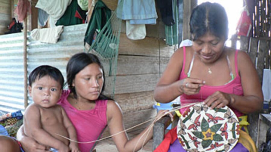 A Colombian indigenous woman weaves traditional handcrafts in her new Panamanian home.