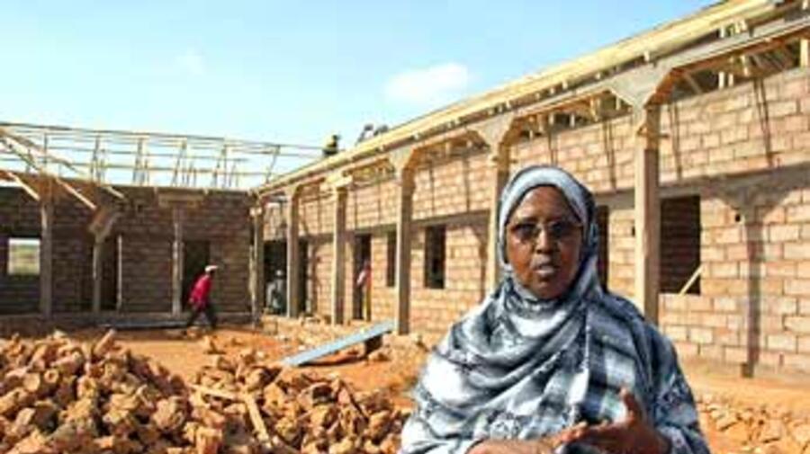 Somali social worker Hawa Aden stands in front of a girls' school and community centre being built with UNHCR's help.