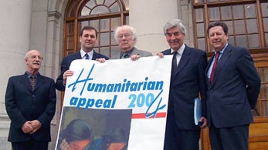 Launching the UN appeal in Dublin were (from left) UN Humanitarian Coordinator for Angola Mario Ferrari, Irish Minister of State for Development Co-operation and Human Rights Tom Kitt, UN Goodwill Ambassador Seamus Heaney, UNHCR's Ruud Lubbers, and UN Humanitarian Co-ordinator for Sierra Leone Alan Doss.