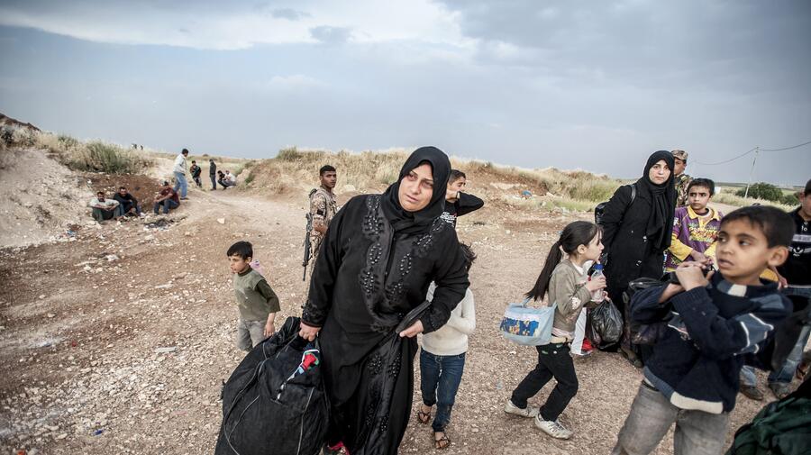 Today, UNHCR field staff are meeting new refugees on Jordan's northern border with Syria. Along with the Jordanian military, they comfort Hala's younger children and help carry their luggage away from the border near Tel Shihab.