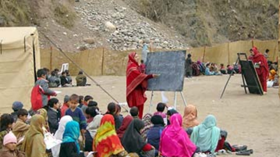 Children attend outdoor classes at Thori Park camp in Chattar Lower, Muzaffarabad, one of the largest camps in Pakistan-administered Kashmir.