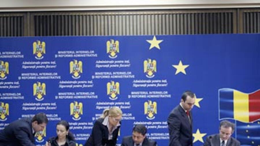 The signing ceremony in Bucharest. Vincent Cochetel, Deputy Director of UNHCR's Division of International Protection Services, is on the right.
