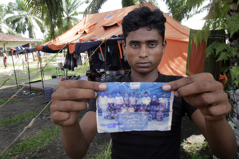 Roshid holds up a family photograph, which he carried with him throughout his journey on smugglers' boats from Myanmar to Indonesia.