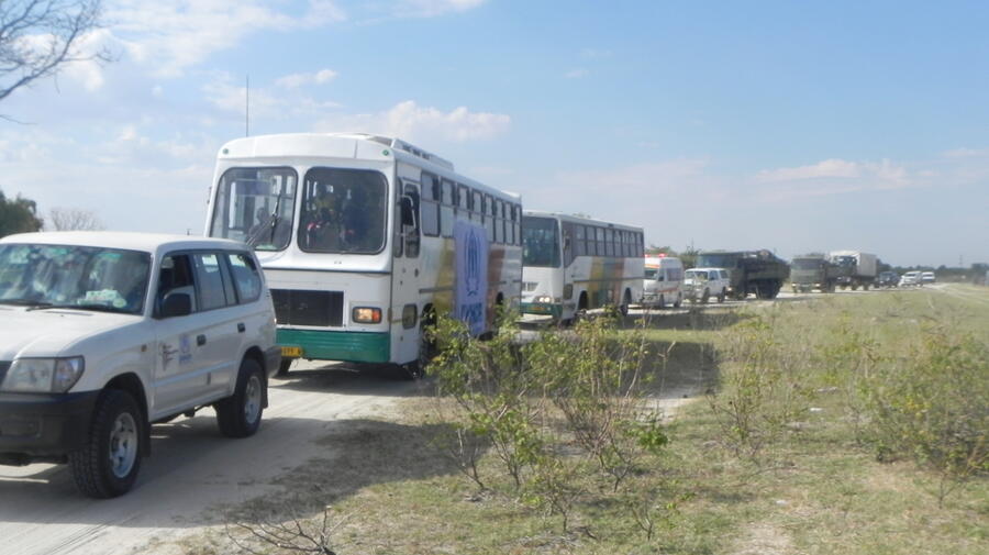 A UNHCR-organized convoy departs from Okakwa transit centre in Namibia on Thursday morning, bringing Angolan refugees back home.