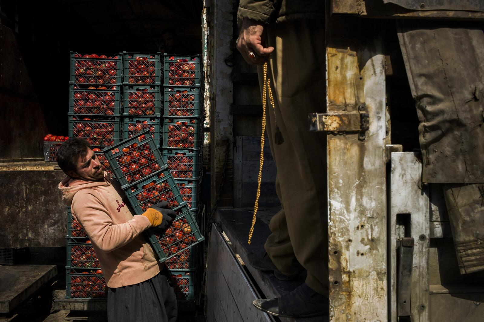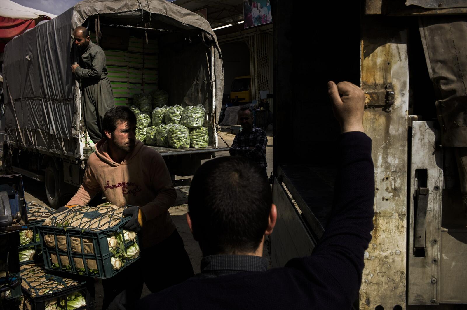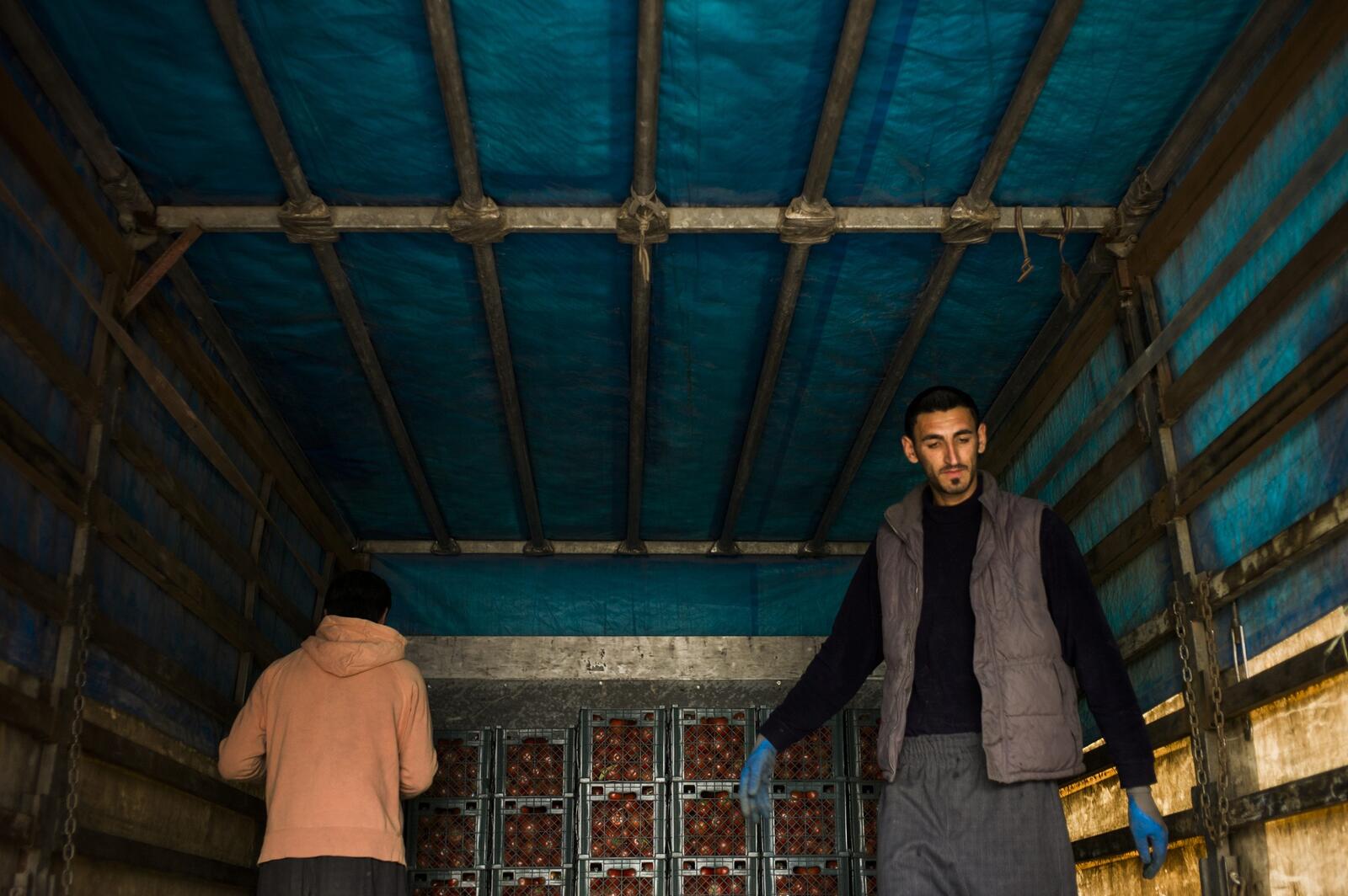 Together with his brother-in-law Muas, 22, Ronak loads and unloads trucks six days a week for shifts that can last 10 hours. "Thank God the work is good here," he says as he waits for the truck he's working on to pull up to the tomato seller. "It's so much better than in Syria. Here we have opportunities."