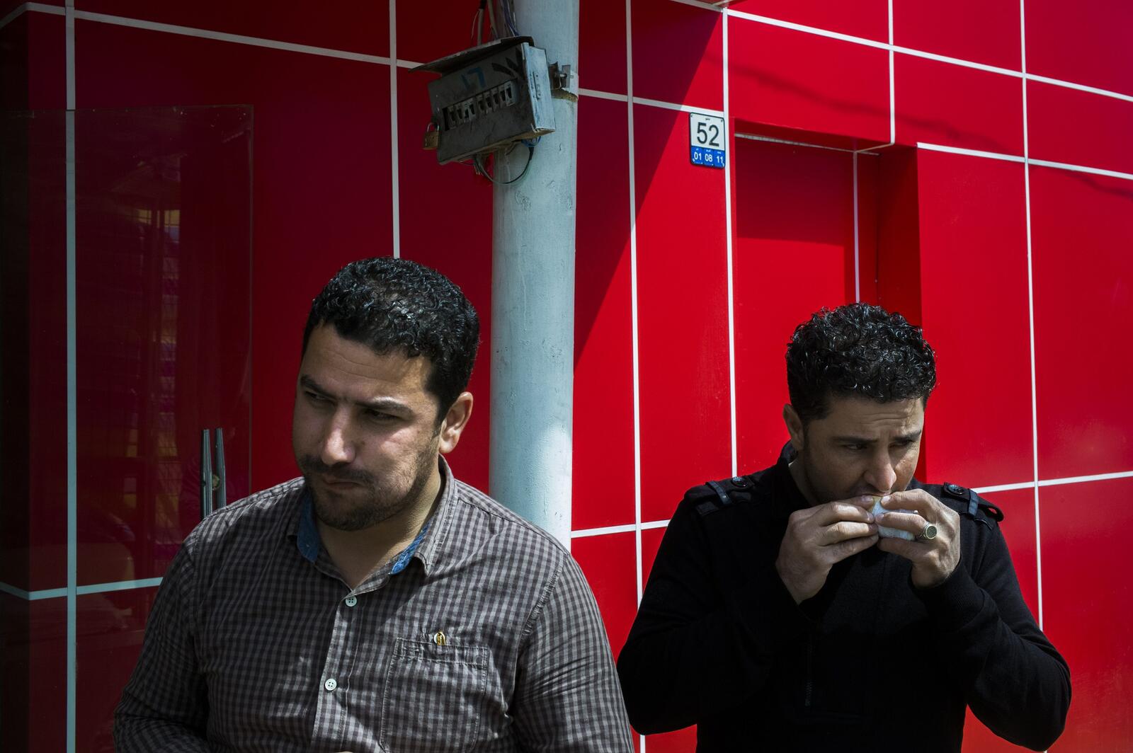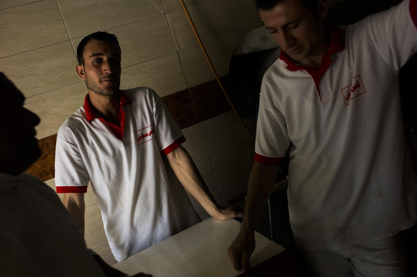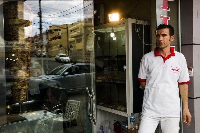 At a Syrian sandwich shop in Sulaymaniyah, Nusheen, 27, is hard at work assembling chicken and beef shawarmas as customers line up on the sidewalk during the lunchtime rush. Originally from Qamishli, he now lives in Arbat refugee camp. He makes the 40-minute commute into the city by bus each morning, and returns the same way each evening. Without the money he makes here, about US $400 a month, he says he'd be unable to support his wife and two children. "Iraqis, they respect us for our cooking," Nusheen says. "When people see Syrians working here, they know the food will be different and good."