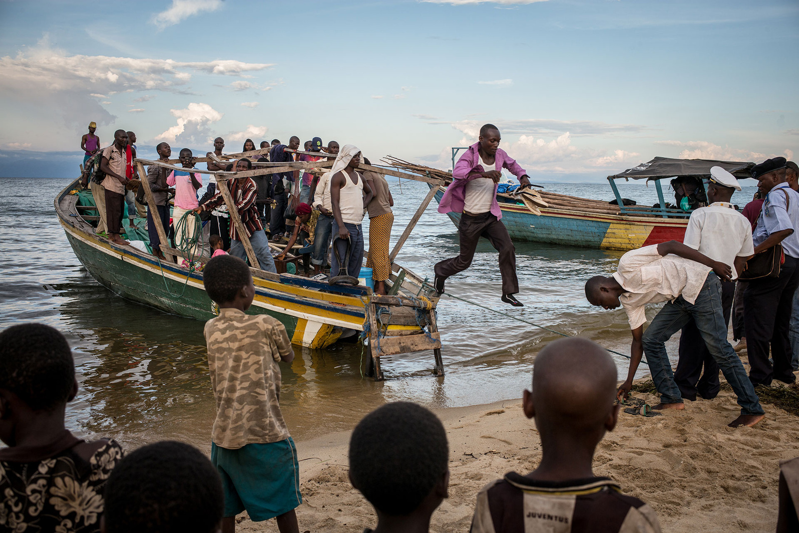 It's 5 p.m. and the sunlight is fading in the Congolese fishing village of Mboko, on the shores of Lake Tanganyika, when we spot two wooden boats on the horizon. Immigration officials and local residents tell us the boats carry refugees from Burundi, where political violence ahead of the presidential election has driven 105,000 people to flee the country in recent weeks.