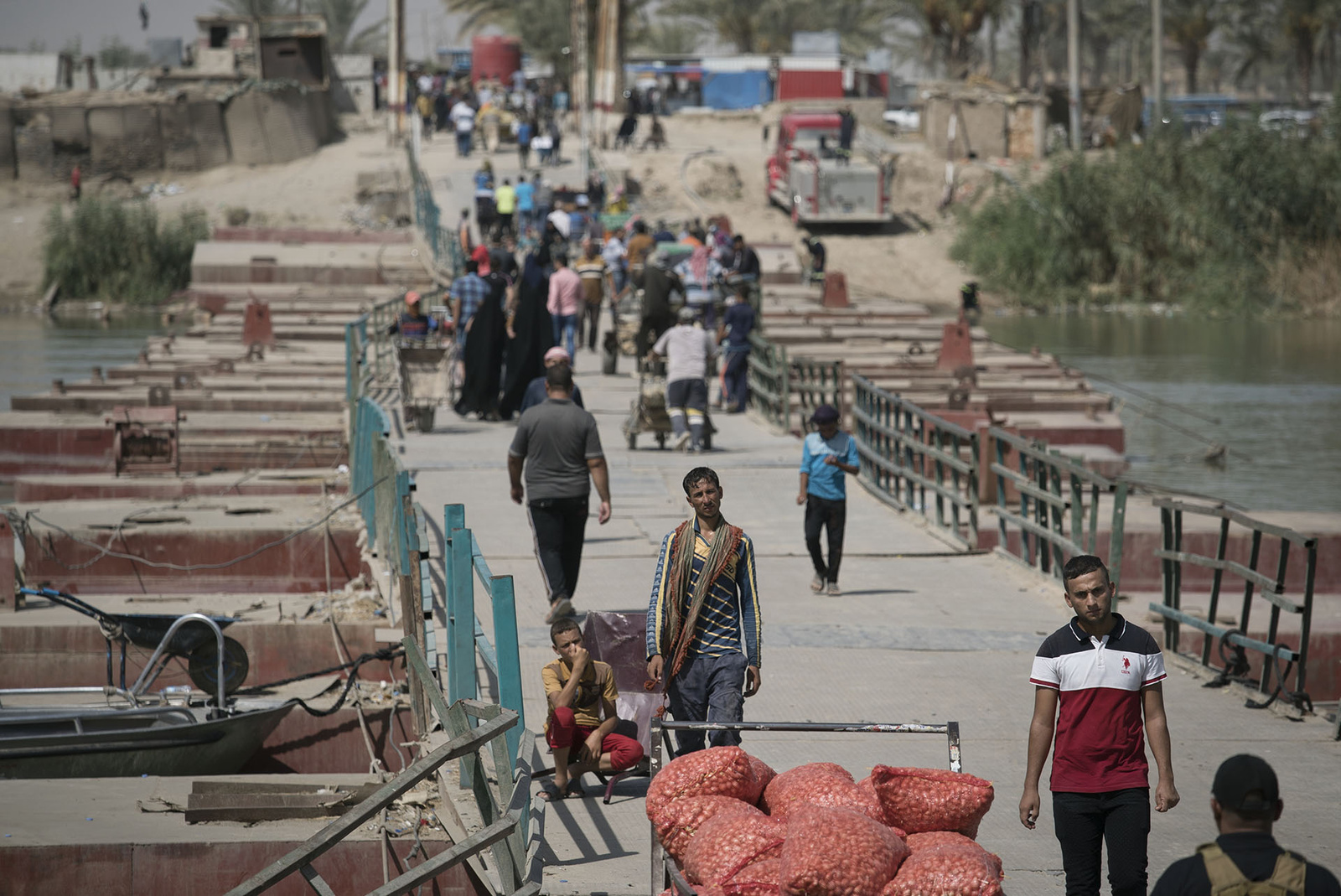 Steady streams of traffic flow in both directions across the floating bridge that spans the Euphrates River near Bzeibiz, Iraq. Young men pushing wheelbarrows full of watermelons, cucumbers and tomatoes weave in and out of families lugging oversized suitcases.