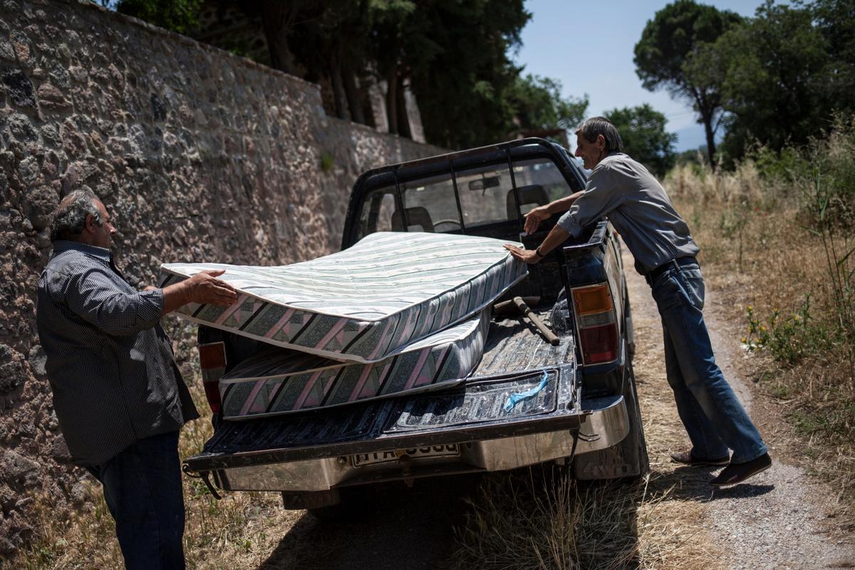 "Every day between one and two hundred people come to Kalloni," the 57-year old Orthodox priest says. "The local people tell them to come to us for help. We give them food, water, milk for the babies, shoes, clothes. They can stay here too: we have blankets, mattresses on the floor."