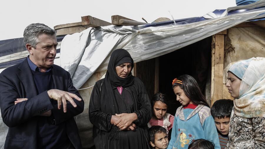 UN High Commissioner for Refugees Filippo Grandi talks with Syrian refugees at an informal settlement near Zahle in the Bekaa Valley, Lebanon.
