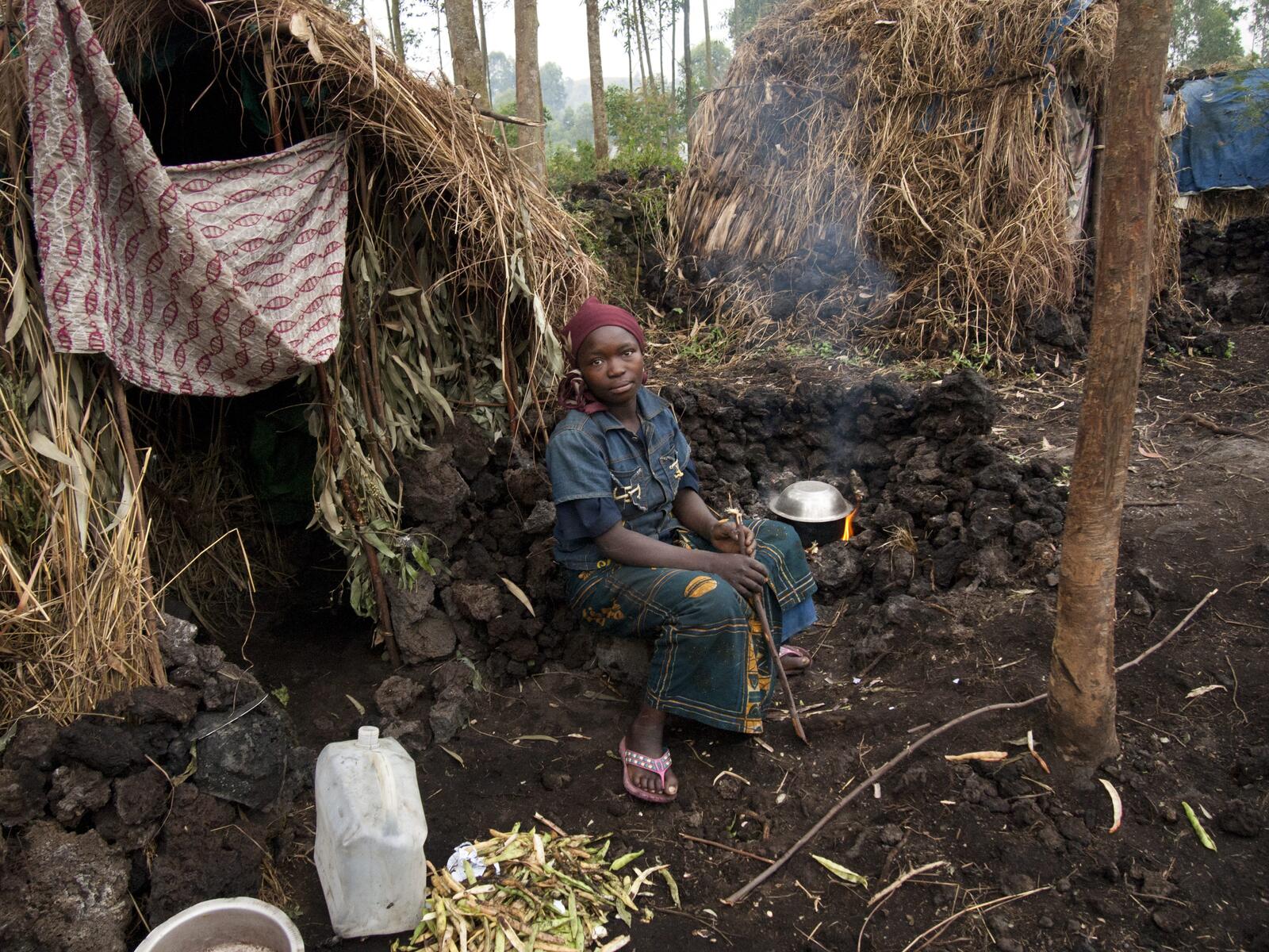 A young displaced Congolese woman cooks dinner in a camp in eastern Democratic Republic of the Congo. Displacement has become a way of life for many in the region, and displaced women are at great risk of abuse, including rape.