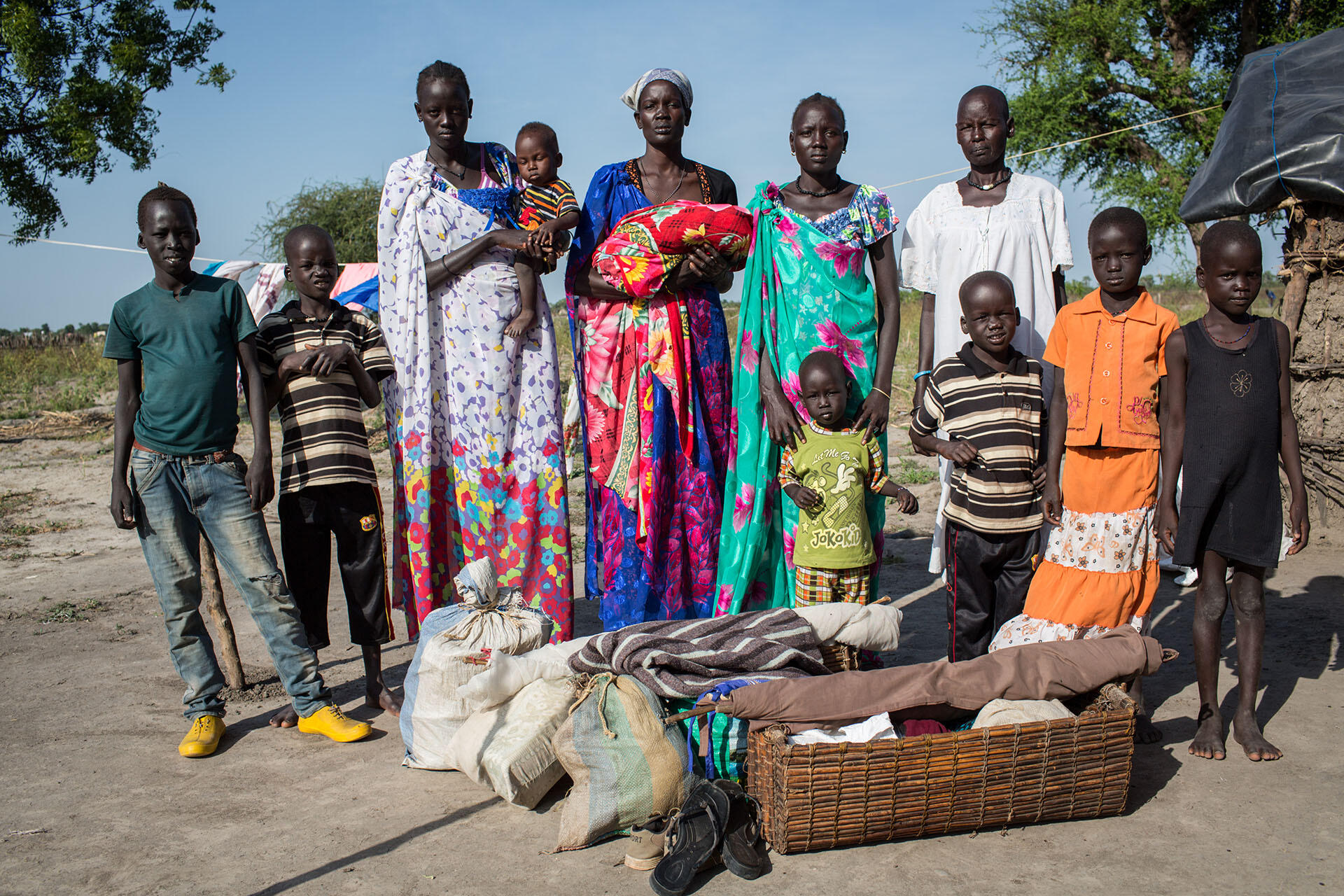 Nyathay (left) and Nyaruach hold two of their young children outside the home of a stranger who invited them to stay for the night in Leer, Unity State, South Sudan.