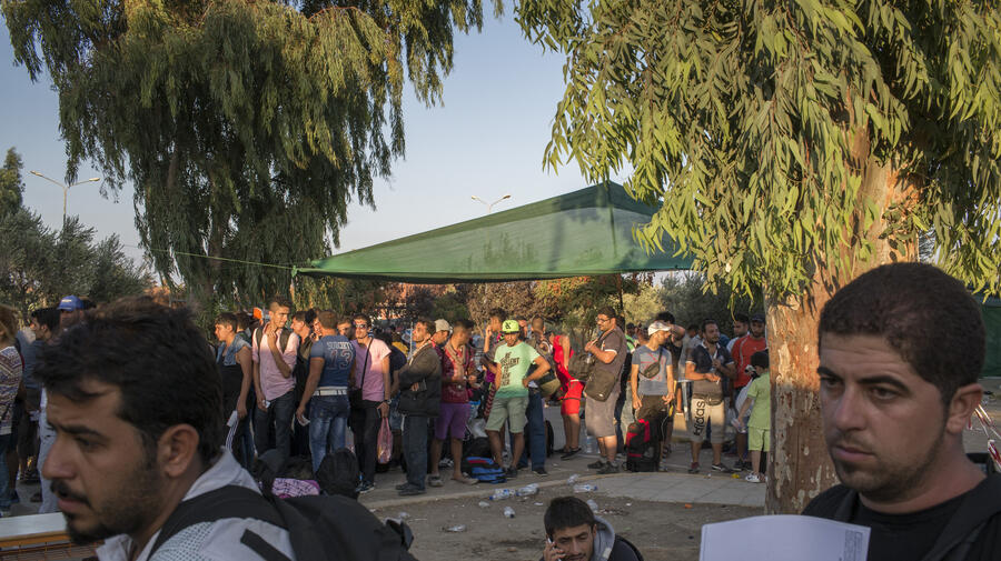 Syrian refugees queue up to register with the Greek authorities at Kara Tepe camp near Mytilini before then buying boat tickets and travelling on to Athens.