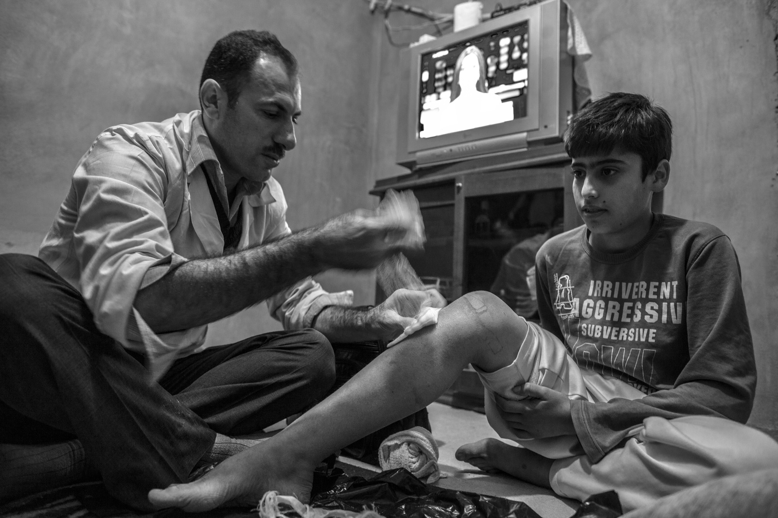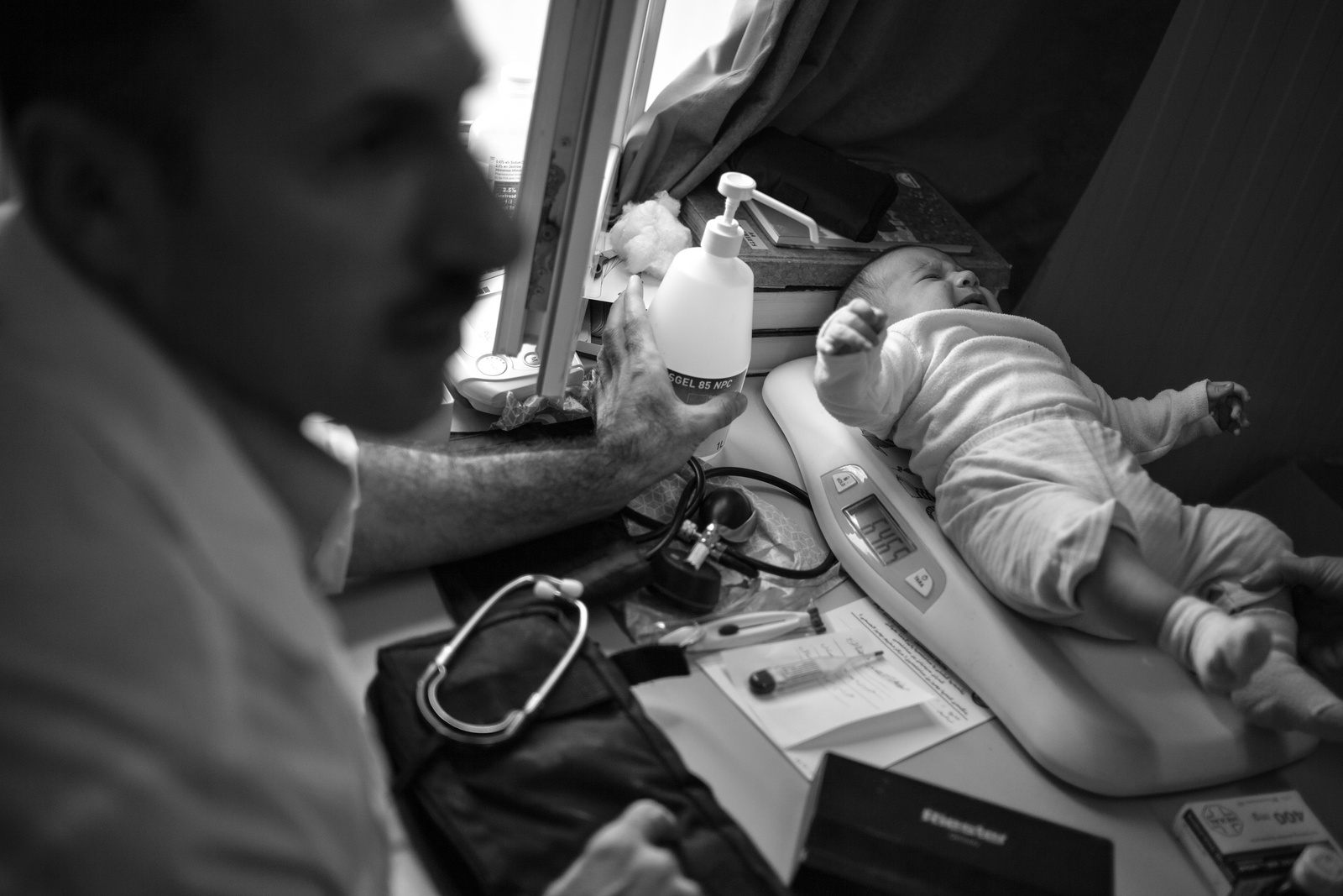After completing his shift at the clinic in Domiz, Dr Hassan visits a nearby tent and examines a Syrian boy.