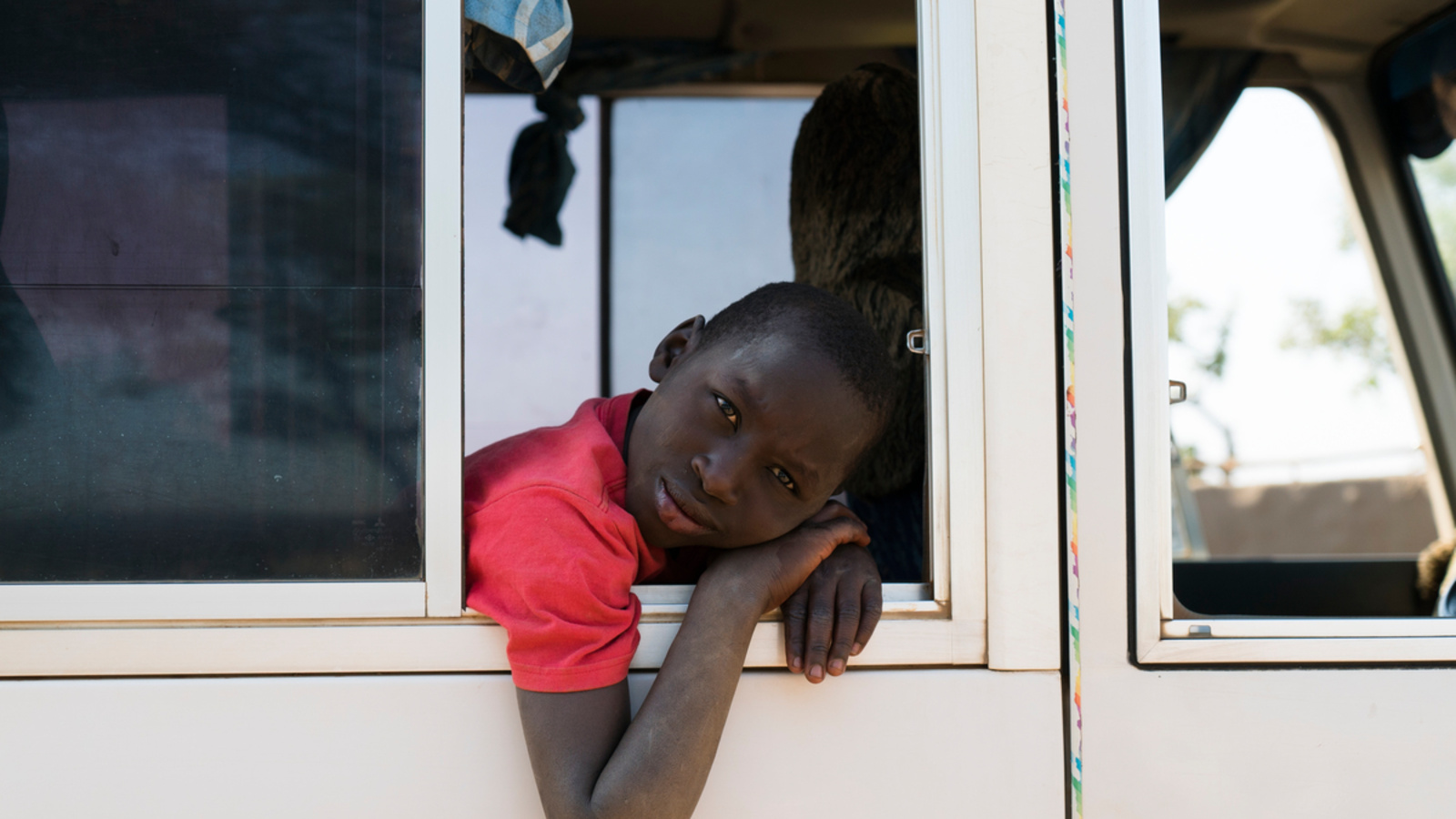 A South Sudanese refugee looks out of a truck before being transported to the recently established Imvepi settlement, at the Imvepi Reception Centre, Arua District, Northern Region, Uganda.