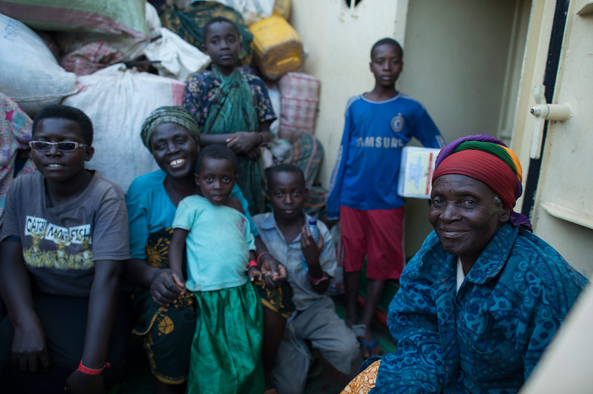 Eighty-year-old Sindatuma Elizabeth sits on the deck of the MV Liemba with her daughter, granddaughter and great-grandchildren. She fled her home in Makamba, Burundi, three weeks earlier and walked for 12 hours to reach Kagunga. She is now a refugee for the fourth time in her life.