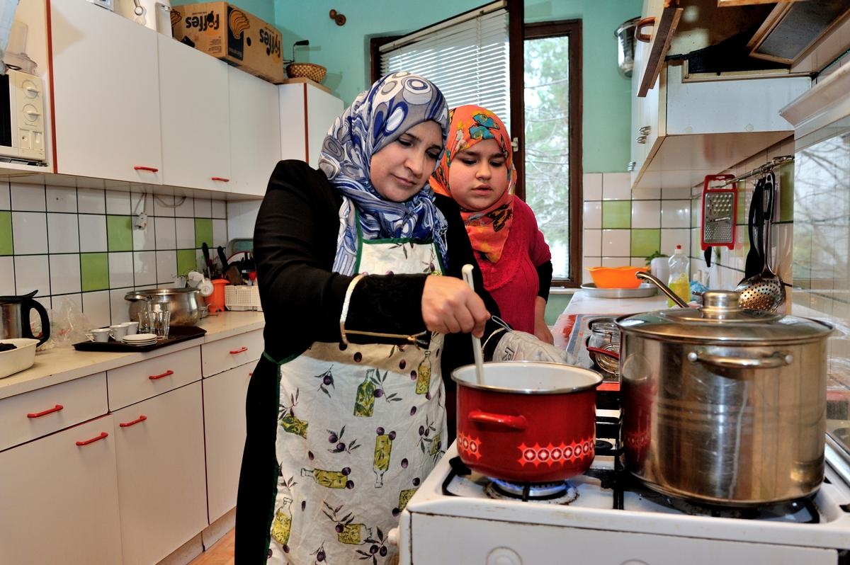Sunday is Izdihar's day off. Her husband takes charge in the kitchen and makes falafel and hummus. Having lost their wedding certificate in the chaos of war, Ameen and Izdihar plan to marry again in Austria this year. "They are a very loving couple and back each other," says Maria. "That's also very important for keeping together the family – they bear responsibility for so many people."