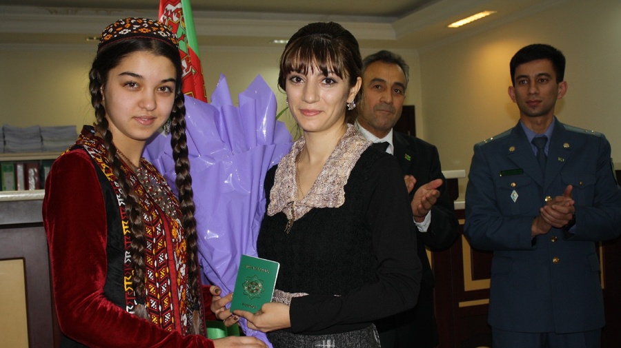 Last month, the State Migration Service of Turkmenistan arranged ceremonies in the capital, Ashgabat, and in Dashoguz, to hand over passports to some of the new citizens. As the men and women walked up to collect their new travel documents, young girls in traditional embroidered dresses and round colourful caps gave them bouquets.