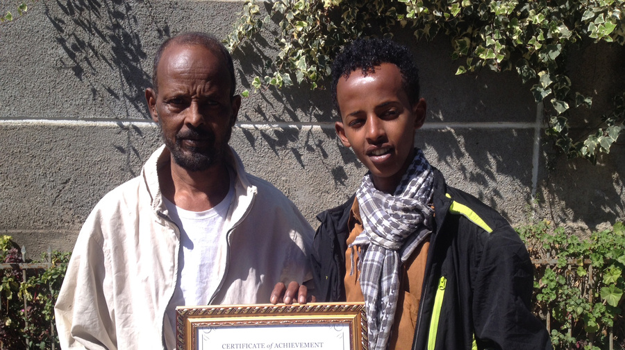 Abdirahim with his stepfather Muhamed after receiving his Certificate of Achievement for the 'My Somalia' art competition.