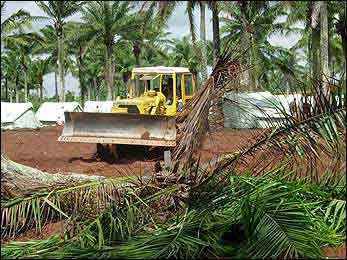 A bulldozer clearing the forest and levelling the ground to build more tents at Lokossa camp in Benin.
