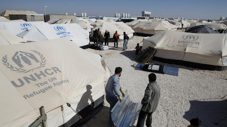 UNHCR protection official Erika Feller visited Za'atri camp, where preparations for winter are well under way. These men are carrying metal sheeting to provide a covered area for cooking.