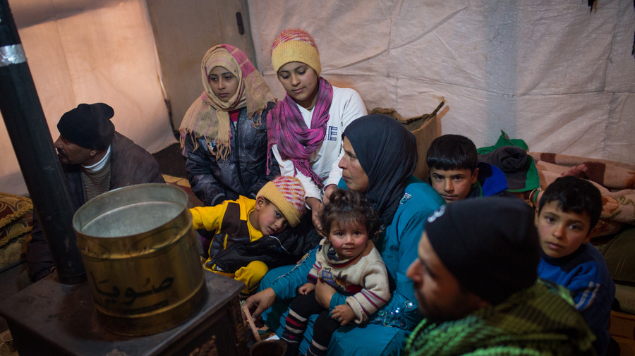 Members of a Syrian refugee family huddle around a stove inside their shelter days ago in Lebanon's Bekaa Valley.