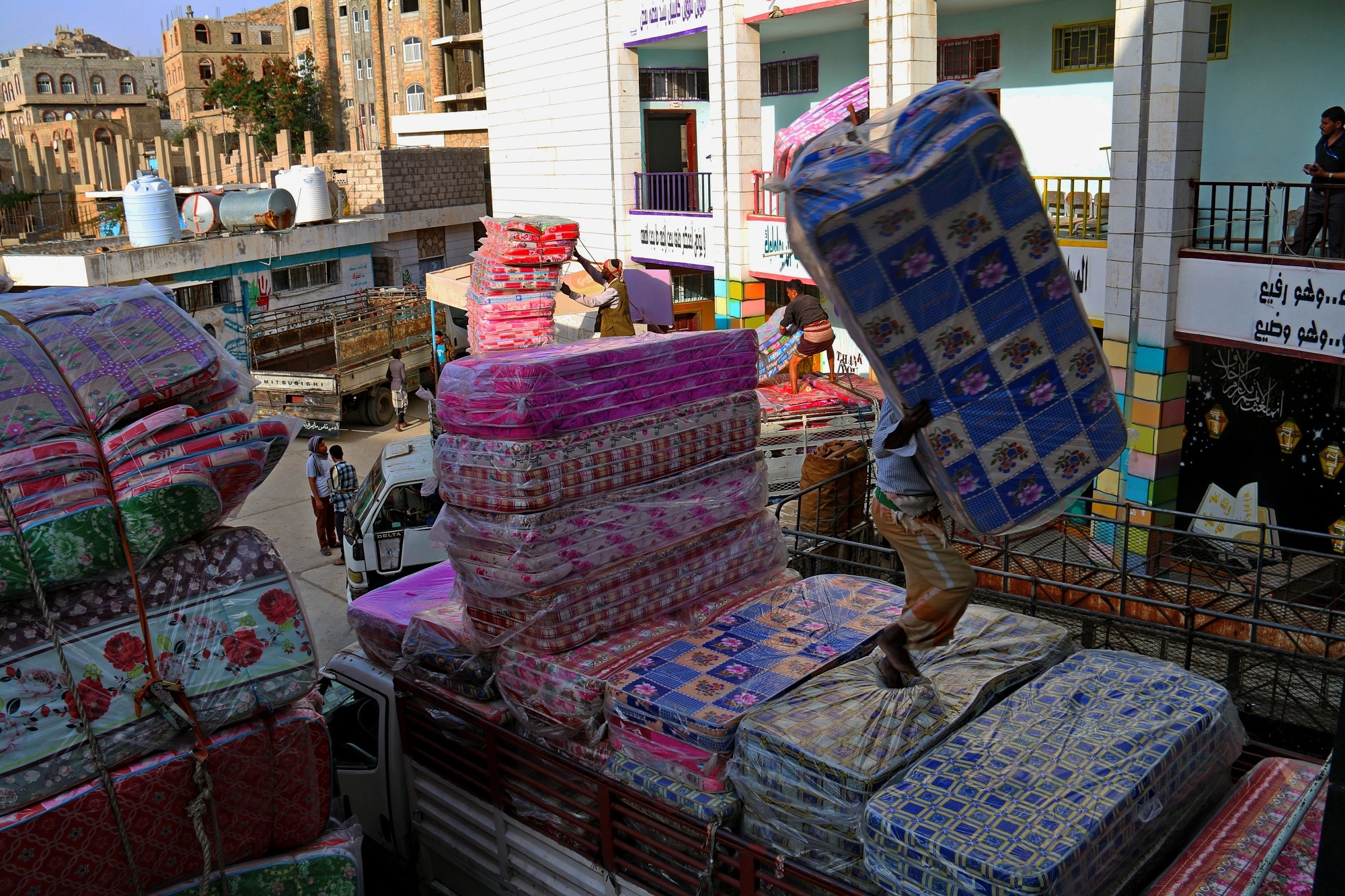 A man unloads a mattress from a truck delivering UNHCR non-food aid in Taizz, Yemen.