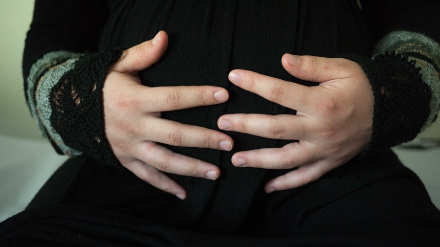 Sixteen-year-old Iman cups her growing belly with her hands. She fled Syria when it became too dangerous and difficult to find food. The child, a girl, is due in a few weeks.