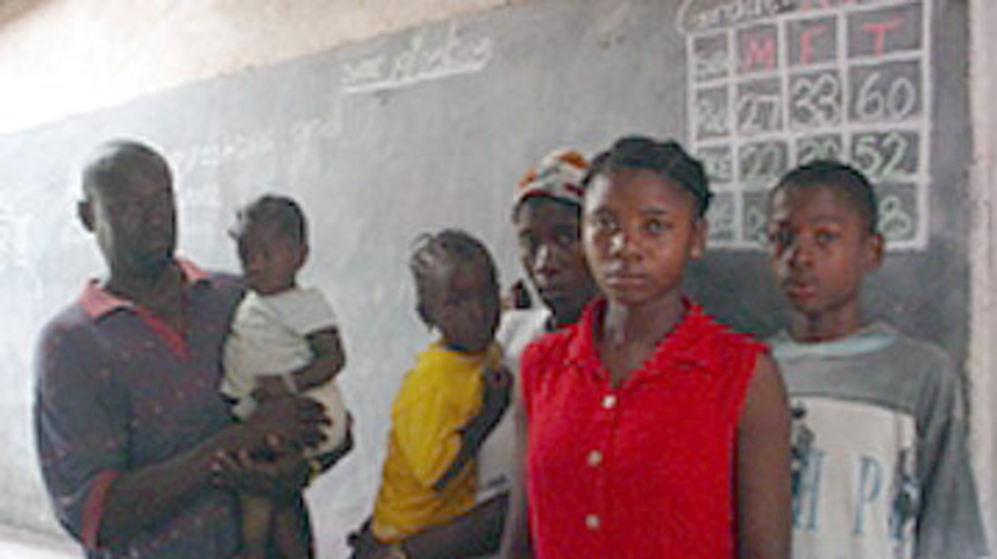 Sierra Leonean refugee Osmane Mansaray and his family in the classroom where his wife is a teacher's assistant in Boreah, Guinea.