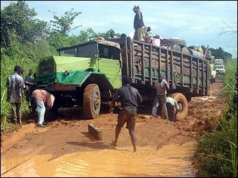This truck carrying Congolese returnees is stuck on a road in the DRC province of Equateur.