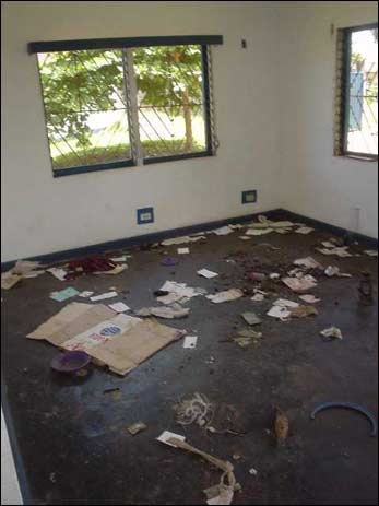 "Everything else is gone," says Hegenauer. "Windows, doorknobs, furniture, telecommunications equipment, even toilets and sinks were taken." The generator was also dismantled and a UNHCR truck, in the backyard, was stripped of virtually all moveable parts.