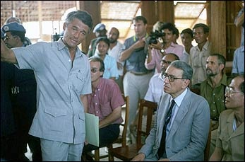 Vieira de Mello with then UN Secretary-General Boutros Boutros-Ghali at Cambodia's Otaki reception centre in 1992.