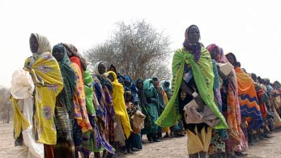 Sudanese refugee women waiting for aid distribution in Bahai border town, north-eastern Chad.