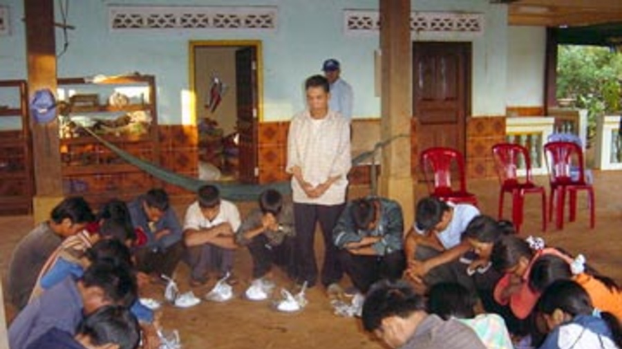 Montagnard asylum seekers pray before taking their meal in a UNHCR facility at Banlung in Ratanakiri province.