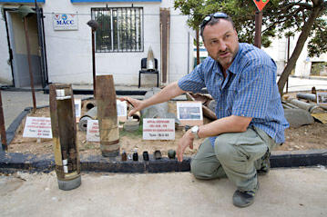 Chris Clark, British programme manager for UNMACC-South Lebanon, uses models to explain the different types of munitions found in southern Lebanon.