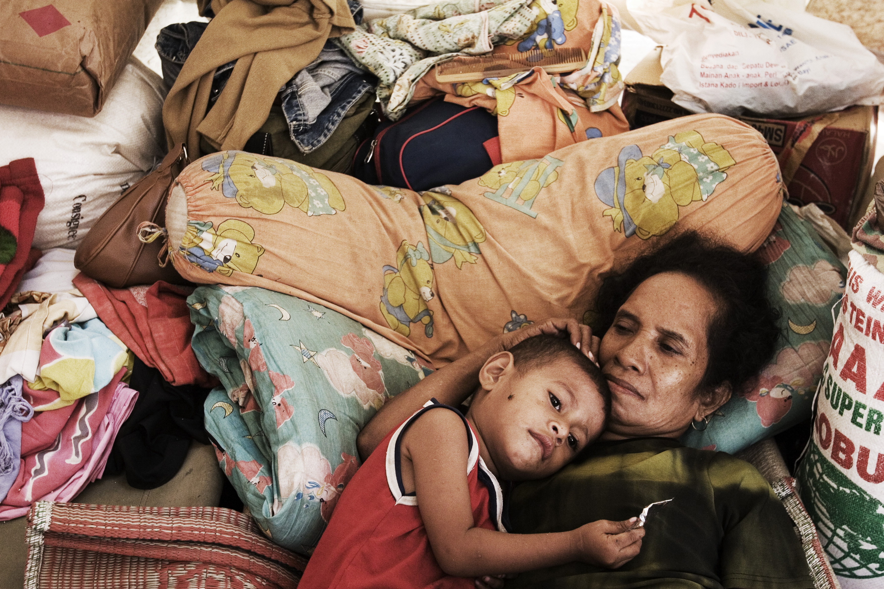 A woman and her son rest in their tent at a makeshift refugee camp at the Canossian Sisters Convent in Dili on Friday, June 9, 2006.