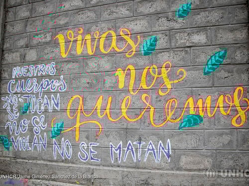 Messages written by women survivors of sexual and gender-based violence are displayed in artwork on the walls of the Cotopaxi Reception House – a safe house for refugee and Ecuadorian women in the city of Salcedo, Ecuador.