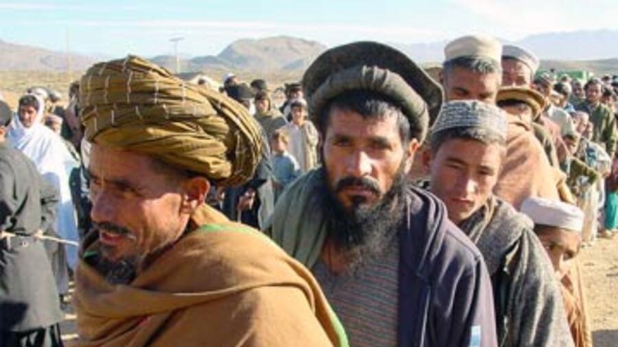 Afghan refugees line up to receive rations of tea and soap from UNHCR at Ashgaro camp. It is one of 12 camps where assistance will be halted at the end of August 2004.